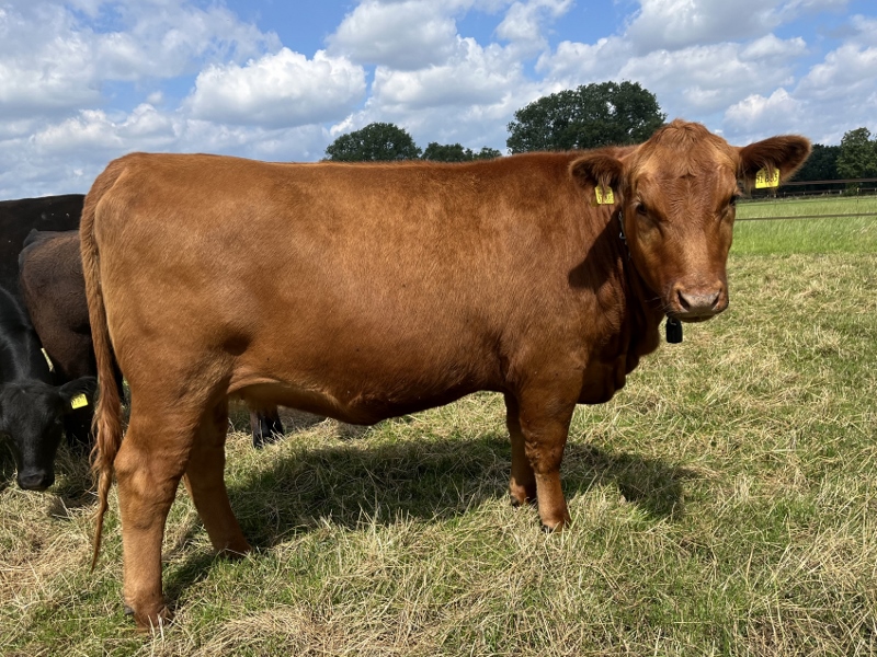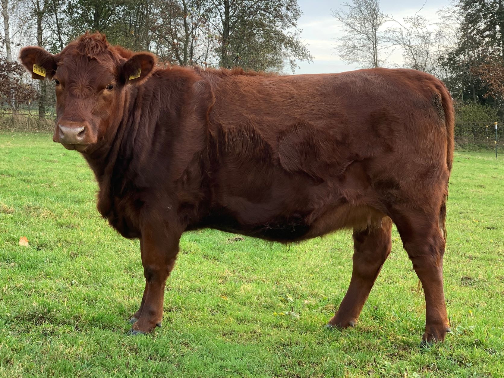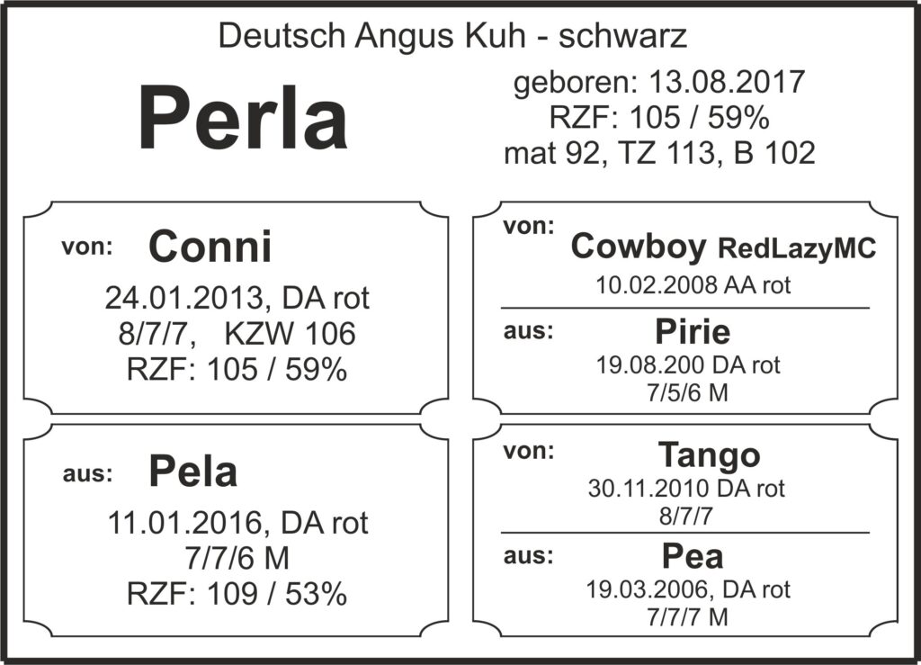 Unsere Perla verkörpert den klassischen  roten Deutsch-Angus Zuchtstamm. Sie ist großrahmig, korrekt im Fundament, fruchtbar, hat enorme Milchleistung und ist gutmütig ausgeglichen im Wesen. Bei Perla dürfen alle Kälber trinken die Durst haben, sie kommt immer zu einem, geht ohne Halfter mit und sie lässt sich sogar reiten. Perla ist die gute Seele, Alpha-Kuh und Über-Mutter der gesamten Herde. Im Sommer 2022 wurde Perla mit Tristan Klassensiegerin und Reserve-Gesamtsiegerin beim Masterrind Wettbewerb in Verden.