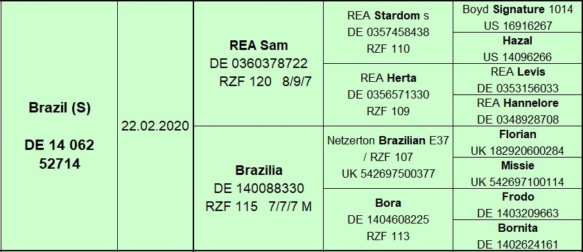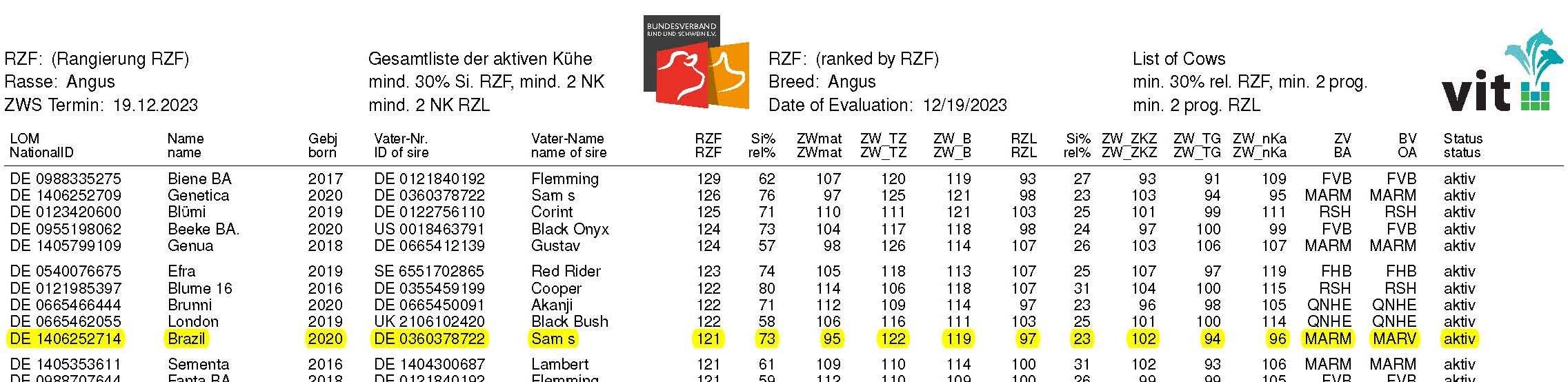Unser Angus-Zuchtstamm mit dem Anfangsbuchstaben B basiert auf unserer Brazil, die wir beim renommierten LfULG, Lehr- und Versuchsgut Köllitsch in Arzberg (Sachsen) erworben haben. Es handelt sich hier um einen sehr gut durchgezogenen Angus-Stamm, der auf den englischen Starvererber Brazilian zurückgeht. Ihre Mutter „Brazilia“ hat einen RZF von 120 und ihr Vater „REA Sam s“ hat eine RZF von 119. Brazil selbst hat einen herausragenden RZF von 121 und rangiert damit als zehnt beste Angus Kuh Deutschlands. Sie ist die aktuell beste Anguskuh der Masterrind Organisation.