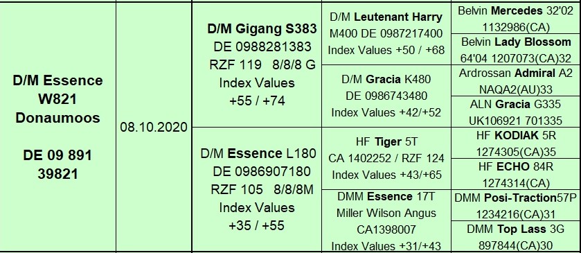 Großmutter DMM Essence 17T kommt als Direkt-Import aus der bekannten Kuhlinie von Müller Wilson in Kanada, welche sich bereits weltweit auf Shows und in der Zucht bewehrt hat. Das ist der gleiche Mutterstamm wie bei unserer Essence-Mittenhof Linie. Großvater HF Tiger 5T war 2008 Canadian Summer Champion und 2009 Grand Champion beim World Angus Forum.