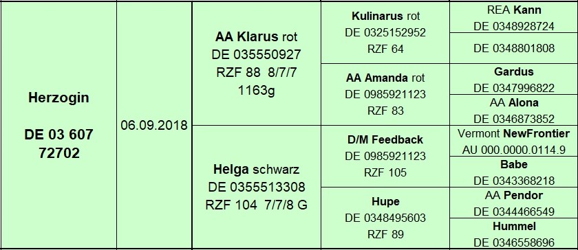 Wir haben einen zweiten Essence-Zuchtstamm vom bekannten hessischen Zuchtbetrieb Mittenhof der Familie Ulrich Heinz in Haunetal. Im Jahr 2024 haben wir Essence_51 vom Mittenhof bekommen, die mit einer Einstufung von 8/8/8 G und Eigenleistungs-Tageszunahmen von 1.494g überzeugt.